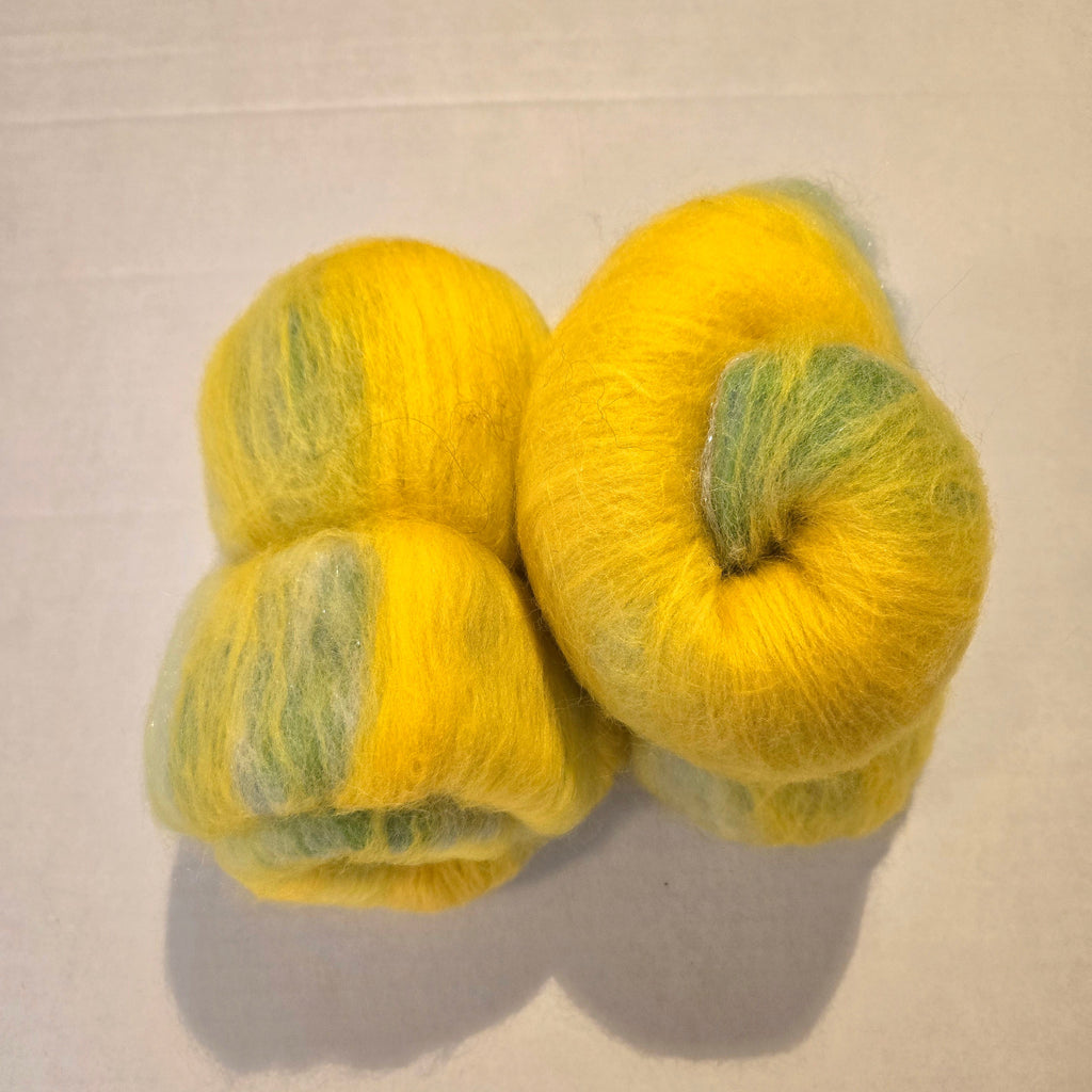 These mini fiber batts are hand dyed and carded from local fibers. Many colors to choose from!